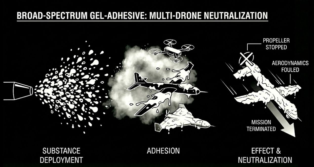 Unlike conventional methods of interception, which use solid fragmentation and explosions to intercept aircraft, we use a gel-adhesive (sticky gel.)